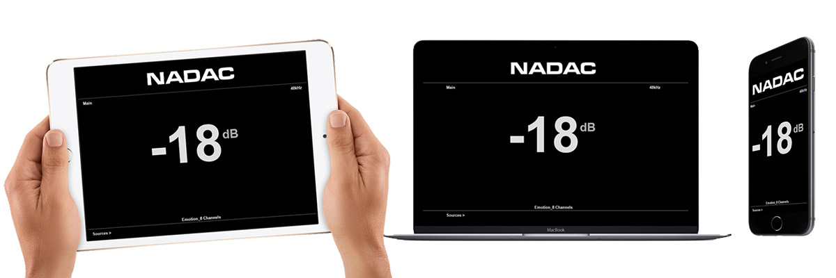 通用的遥控器 •菜单功能和音量可采用基于互联网进行遥控。任何具备互联网功能的智能手机、平板电脑或是电脑都可以控制网络上任何一台NADAC 的音量以及节目源的选择。这使你能够用手机或平板电脑,对你建筑内的任何一台NADAC进行独特的遥控。
