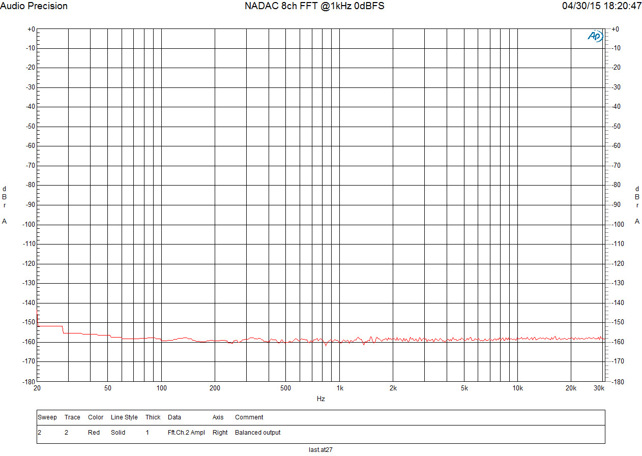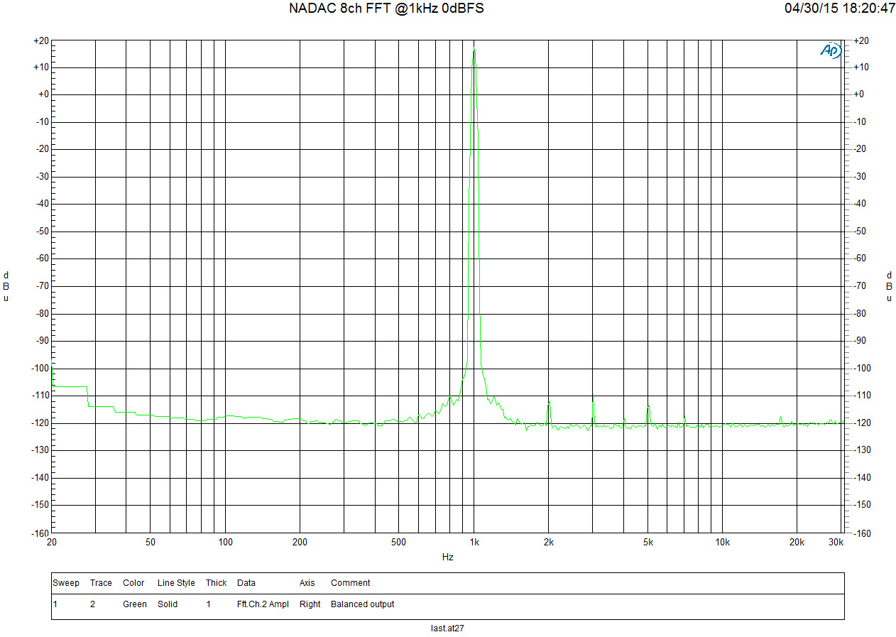 模拟平衡输出 •连接器: 镀金XLR插座(公) •阻抗:40 Ohm •最大输出电平:18 dBu (6.1 Vrms) •多通道动态范围:124dB(A) •多通道总谐波失真+噪声 在1kHz:-113 dB (0.00022 %) •立体声动态范围:130 dB(A) •立体声总谐波失真+噪声 在1kHz:-116dB (0.00016 %)